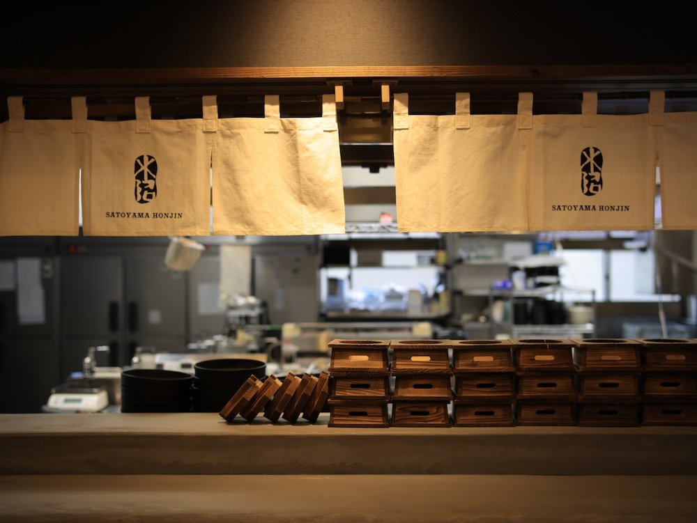 水沼の湯に併設された食事処『里山本陣』の厨房カウンター。暖簾の向こうに見えるのは、地元食材を活かした郷土料理を丁寧に調理する調理場の風景。