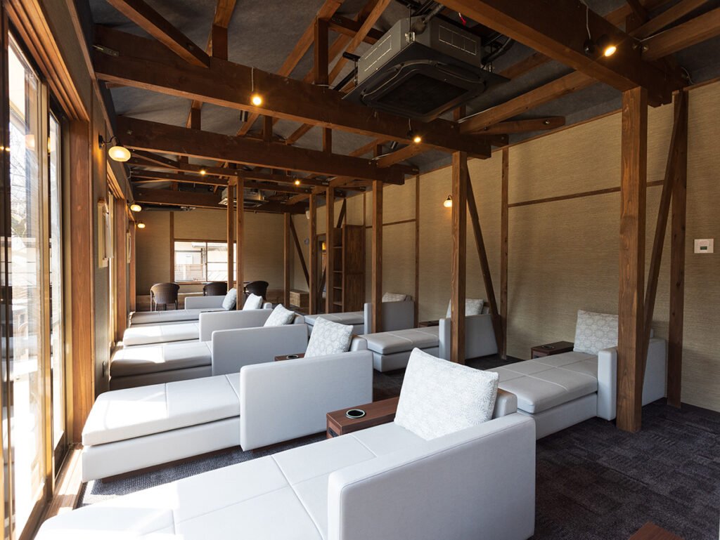 館内着着用エリア「木もれび庵」のリクライニングスペース。大きな窓から光が差し込む、湯上がりの休憩空間。