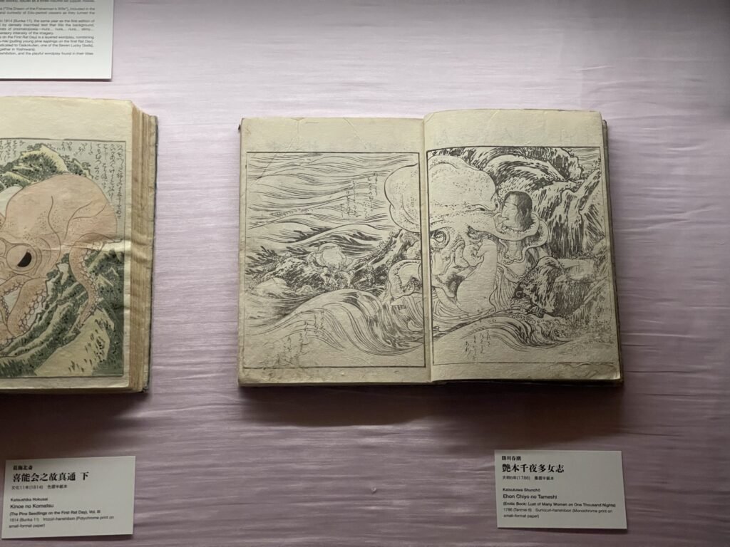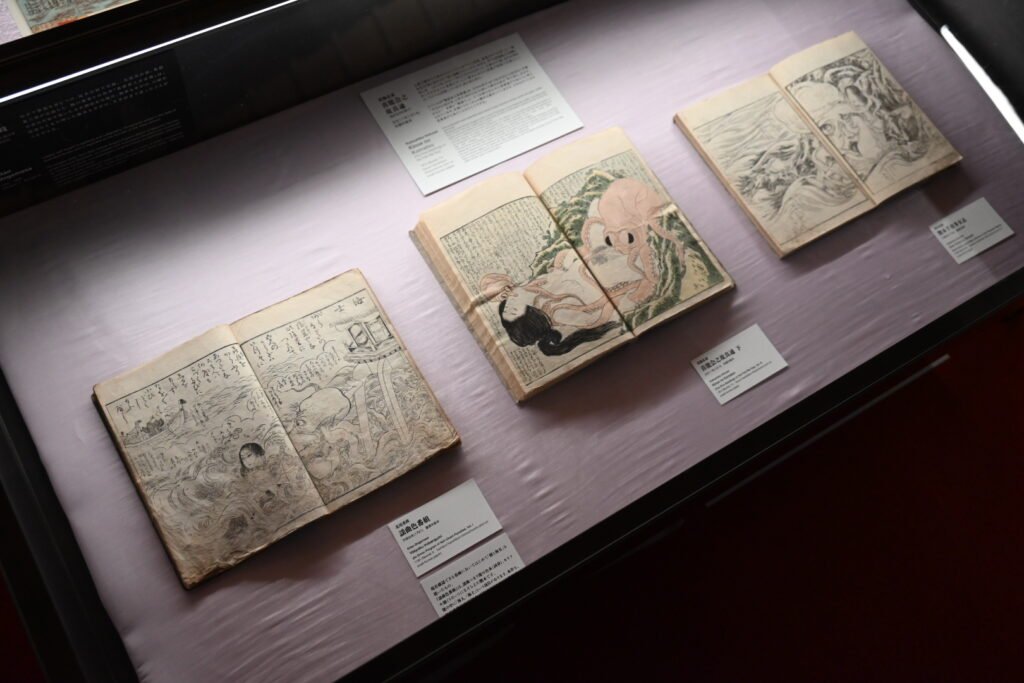 本展の大きな見どころのひとつが、北斎『喜能会之故真通』より《蛸と海女》の特別展示だ。展示期間は4月4日から12日、5月1日から10日までの二期に分かれている。会場では、この作品だけでなく、その系譜をたどる展示もあわせて構成されている。