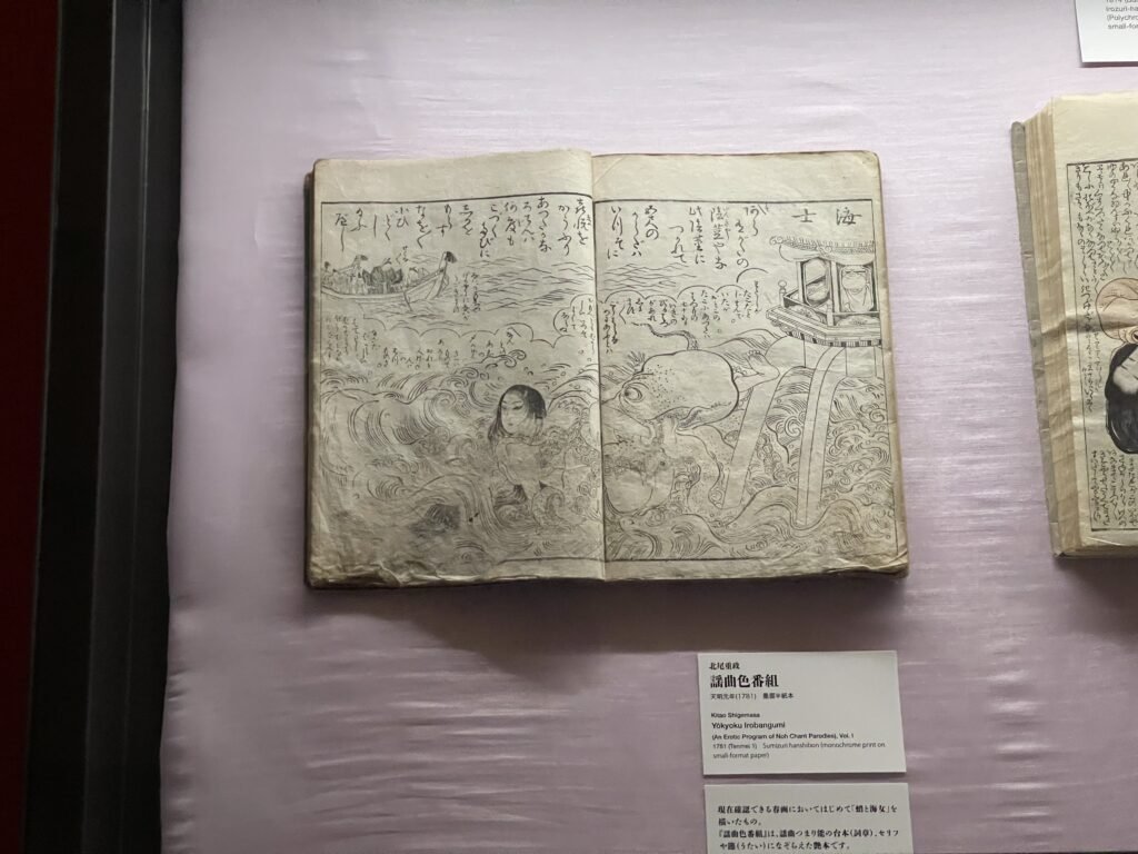 北斎の有名作として単独で眺めるだけでなく、その前後にある図像の流れごと見ていくことができる。《蛸と海女》のモチーフが北尾重政や勝川春潮らの先行作、さらに『日本書紀』の「海女の玉取神話」にまで遡る流れの中で展示されている。