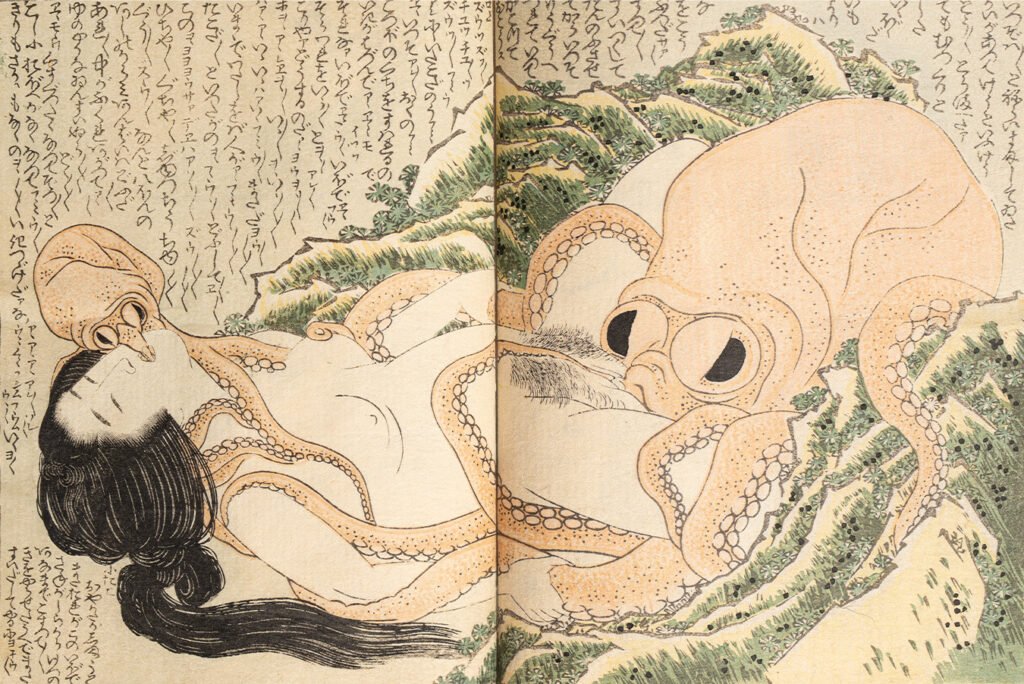 1814年、葛飾北斎は「鉄棒ぬらぬら」という挑発的な筆名で、一枚の見開きを世に出しました。艶本『喜能会之故真通』に収められたその図──通称《蛸と海女》──は、以来200年以上にわたって、称賛と困惑、誤読と再発見を繰り返してきました。この図を「怪奇なエロス」だけで受け取ってしまうと、表現の半分にも届きません。春画とは何か、アートとは何か。一枚の見開きから、その問いは思いのほか遠くまで伸びていきます。