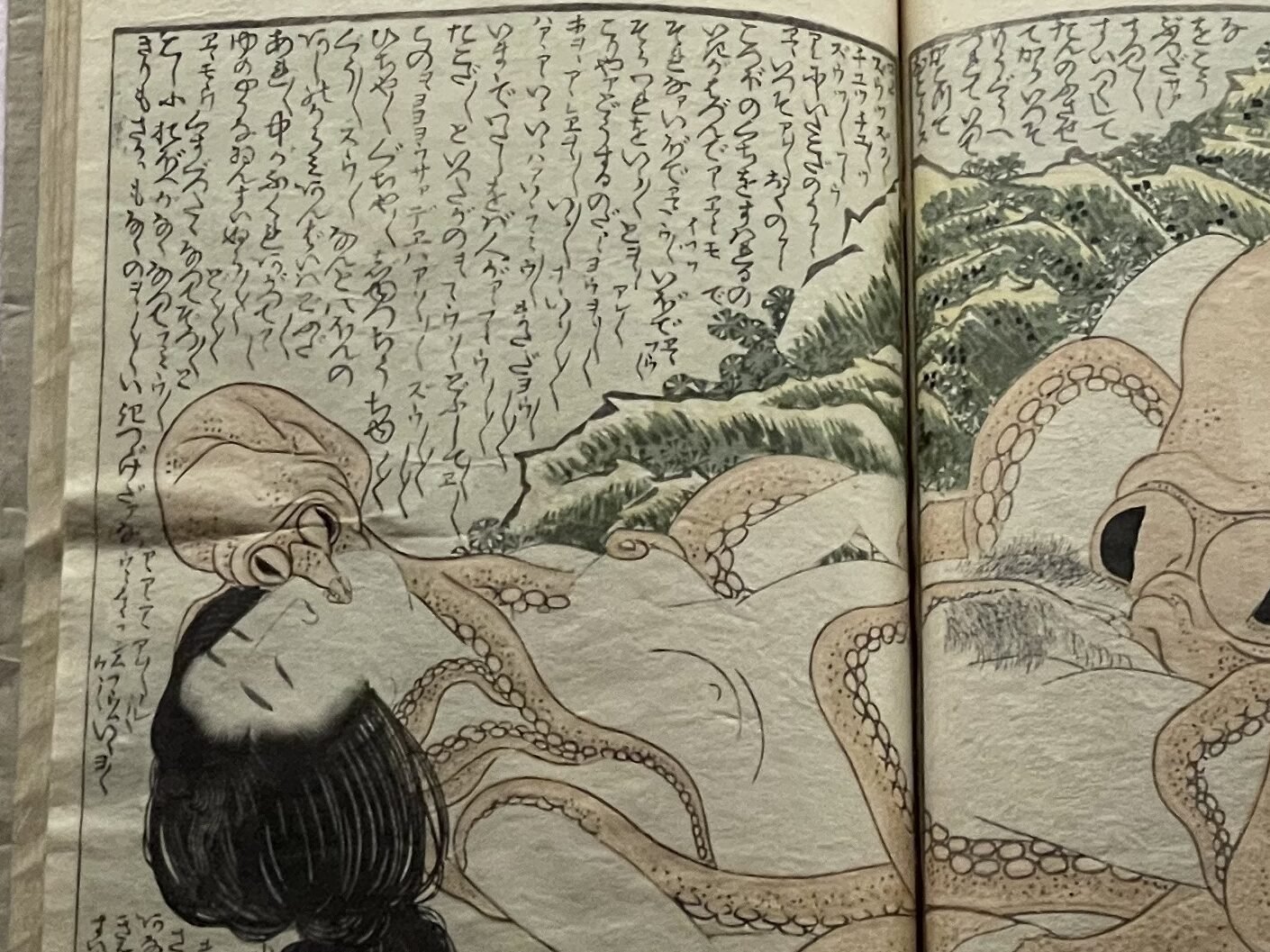 《蛸と海女》の画面中央には、白い裸身が大きく横たわっています。右から大蛸がのしかかり、左の小蛸が口元に吸いついています。余白を埋め尽くすように、びっしりと詞書が流れ込んでいます。