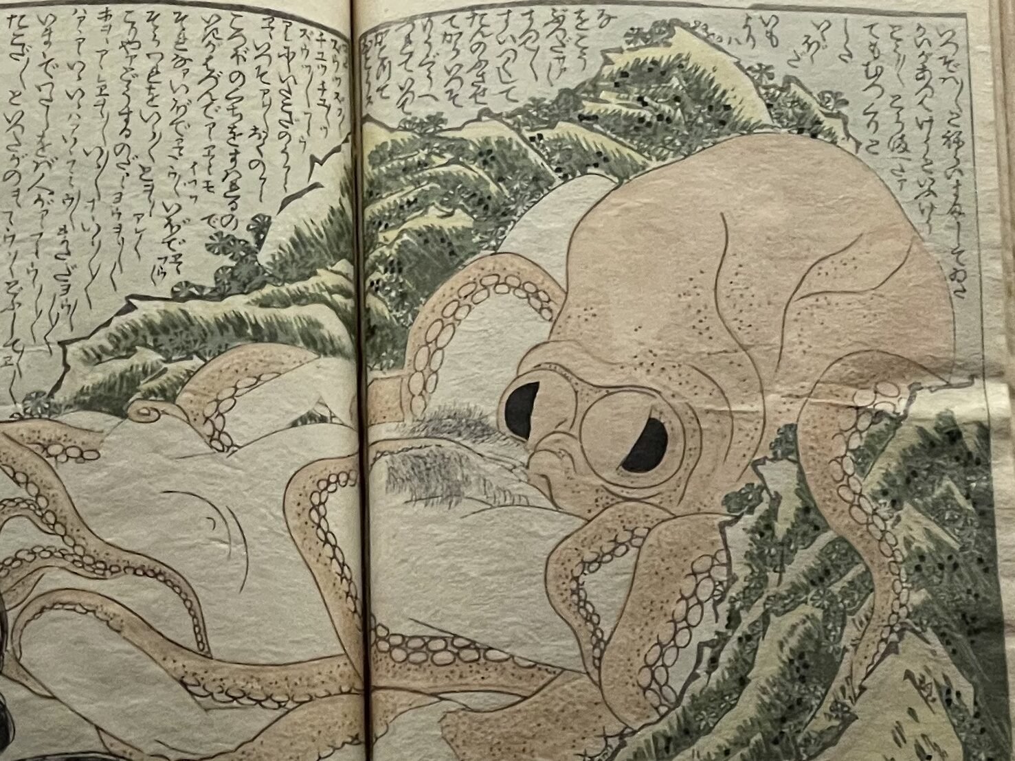 海女の声には、悲鳴だけではなく、驚き、快感、戸惑い、可笑しみが入り混じっています。そして小蛸は「おやかたがしまうと、また、おれが……」と、順番待ちの気配をにじませます。