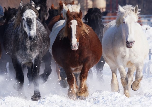 馬が三頭並んで雪道を走っている。