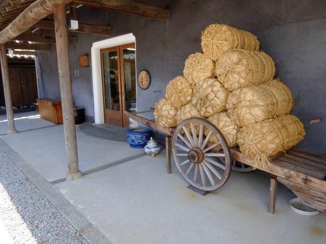 荷車に米俵が沢山積まれている様子。