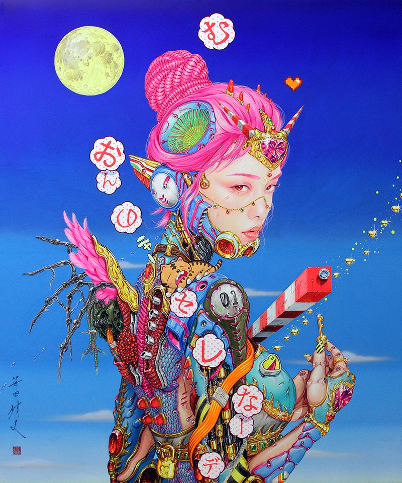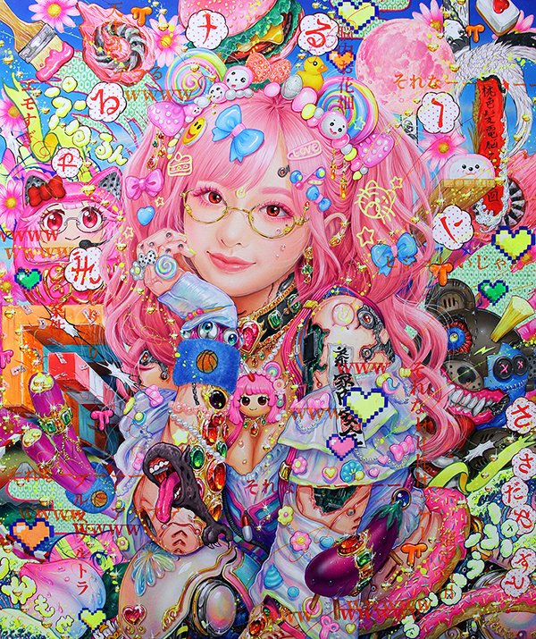 本展では、新作『花魁道中』のほか、『純情エンジン』『無音のセレナーデ』『ギャルメルヘン』などの新作を含む計20点を展示しています。個展タイトルの「OVERLOAD」は「過負荷、詰め込みすぎ」を意味し、画面を埋め尽くすような情報量そのものが、今回の展示の核になっています。