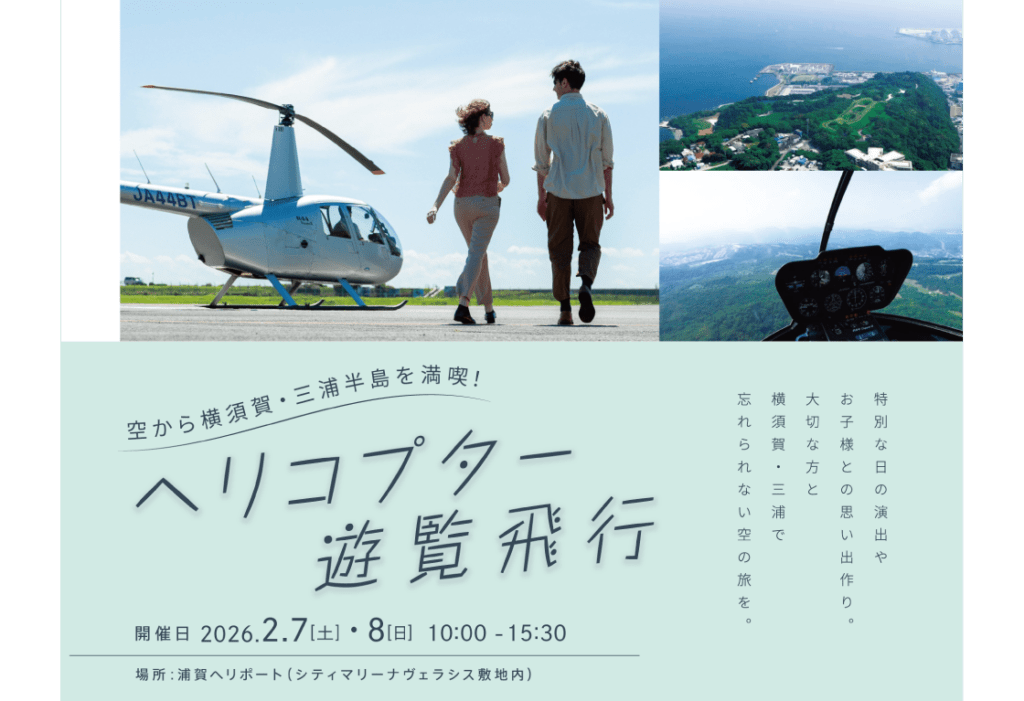 2026年2月7日(土)・8日(日)の2日間、浦賀シティマリーナヴェラシスのヘリポートを離発着するヘリコプター遊覧が実施されます。悪天候時は中止となる場合があります。受付は浦賀シティマリーナヴェラシス第2駐車場で行われ、離陸の30分前までに来場する必要があります。