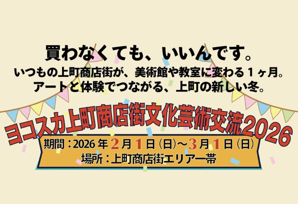 2026年2月1日(日)から3月1日(日)まで、上町商店街全域で「ヨコスカ上町商店街文化芸術交流 2026」が開催されます。豊島小学校の児童や横須賀ゆかりのアーティストの作品が商店街のお店に並ぶ「まちかど美術館」や、店主からプロの技やこだわりを学べる「上町文化回遊」など、いつもの商店街を美術館や教室のように楽しめる取り組みです。開催に先立ち、2月1日(日)にはうわまち広場でオープニング・レセプションが実施されます。